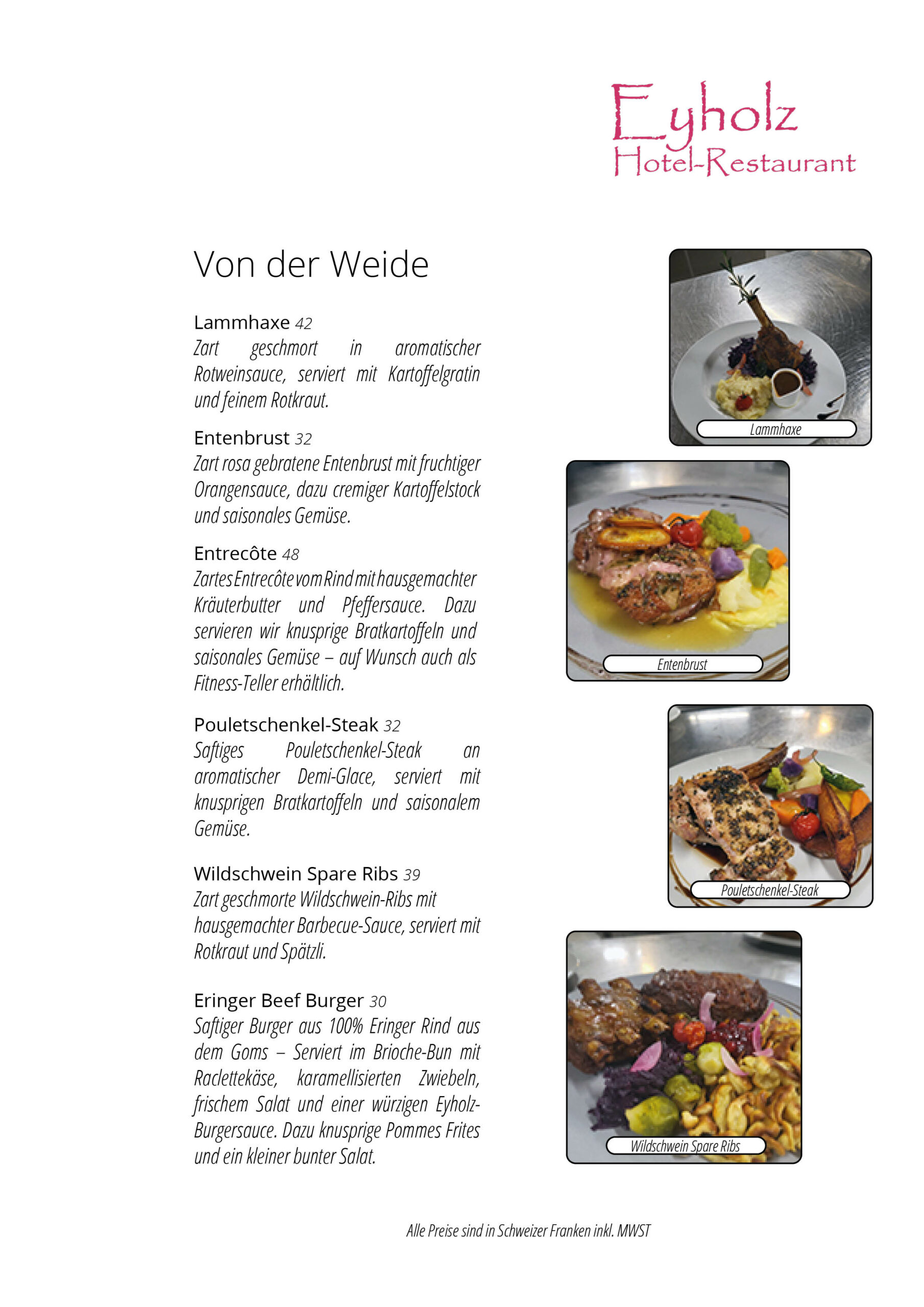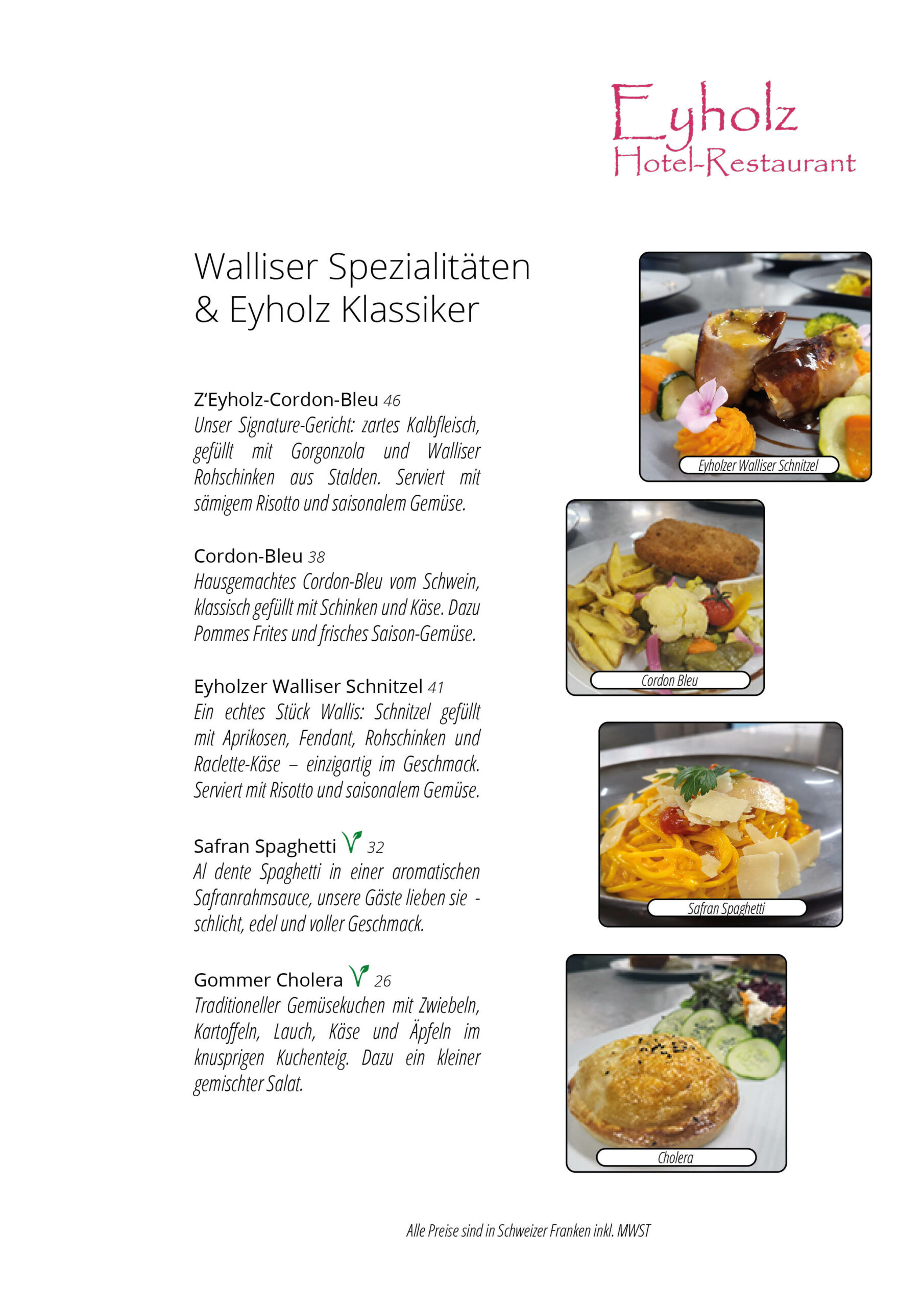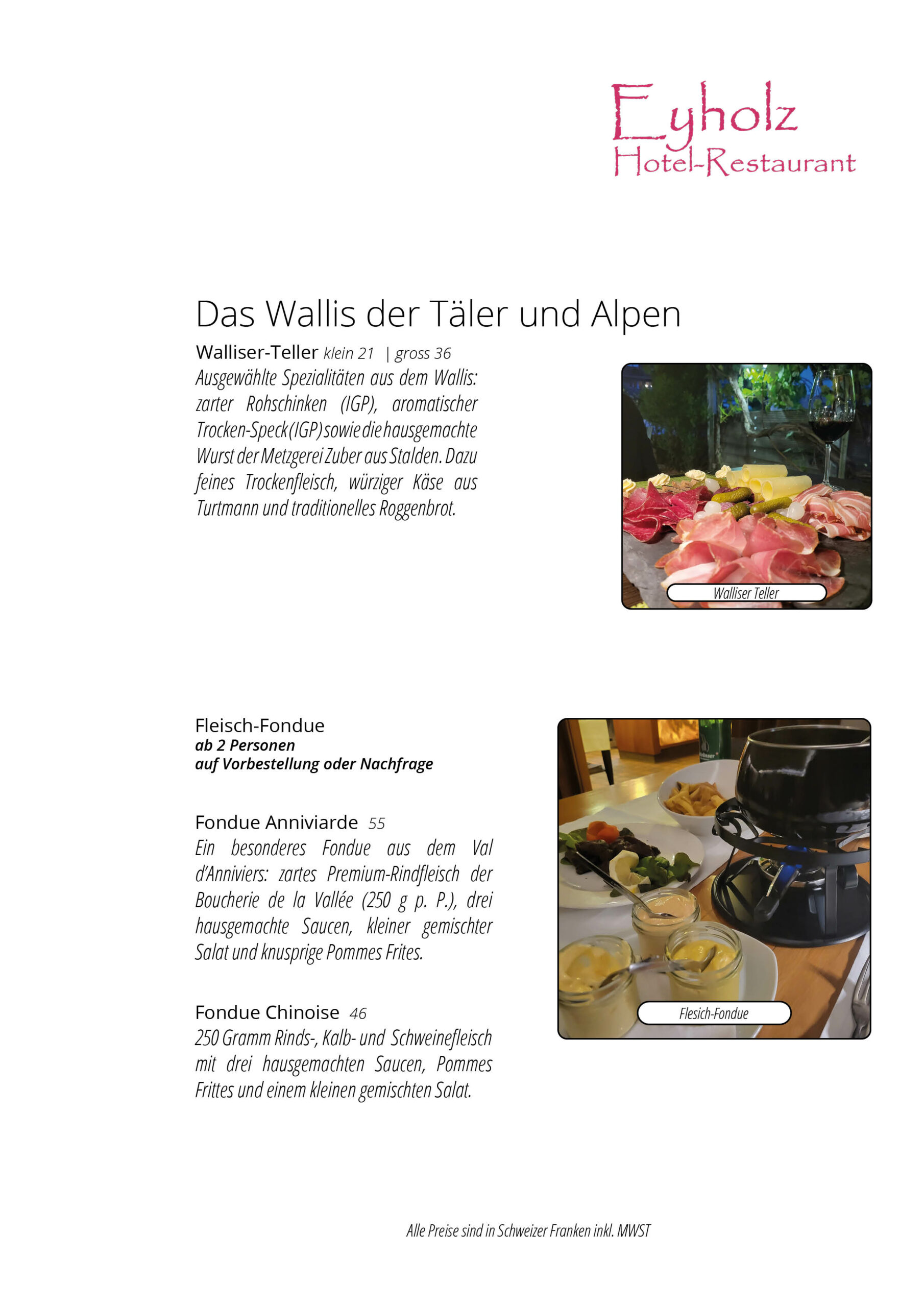 Wir pflegen eine frische und geschmackvolle, regionale Küche. Weit weg von Convenience-Produkten geniessen Sie Walliser Spezialitäten.