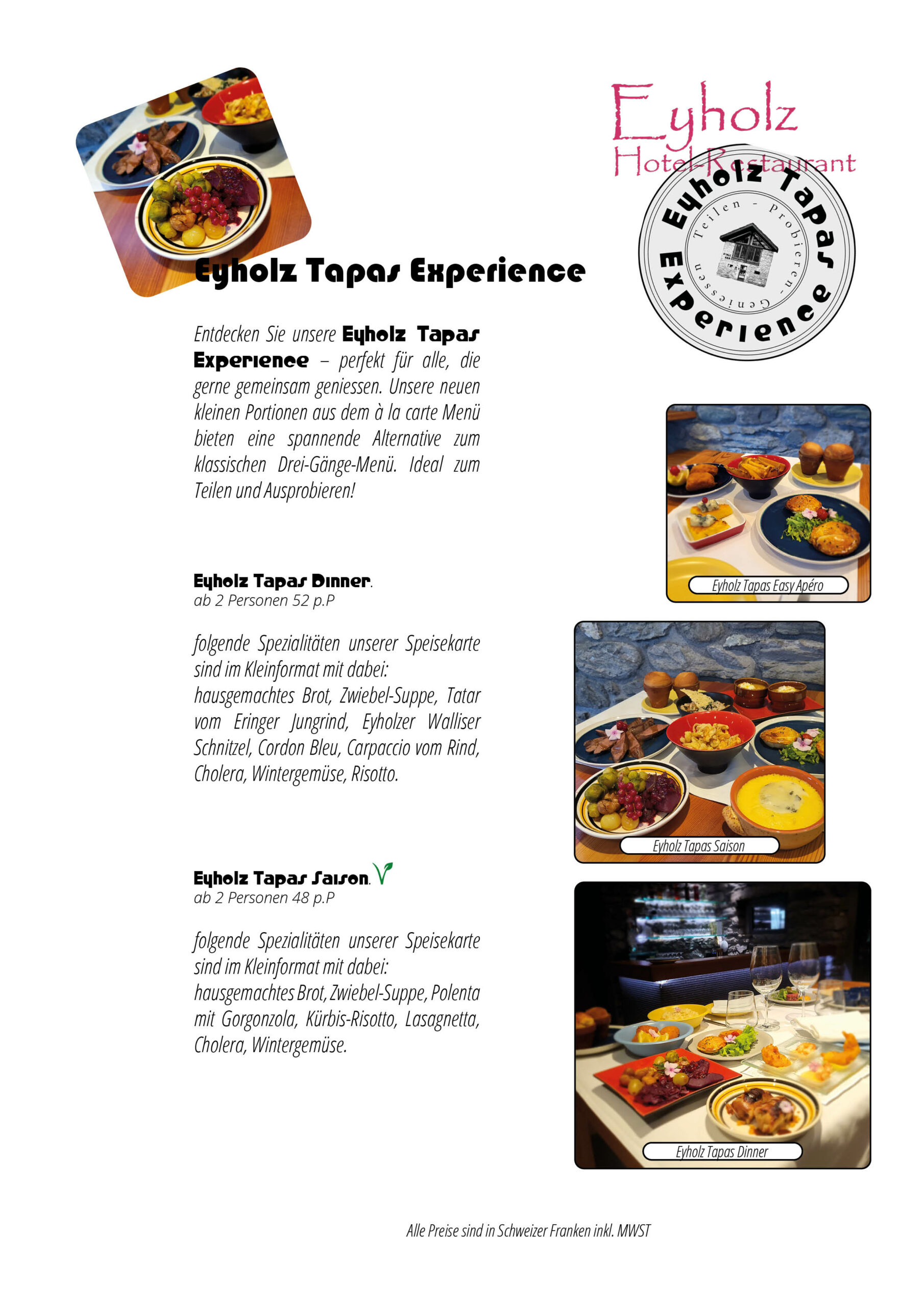 Geniessen Sie exklusive Erlebnisse wie den Eyholz Grill, die Eyholz Tapas Experience und das Fondue Anniviarde in unserem schönen Ambiente. Der freundliche und aufmerksame Service ist da für Sie.